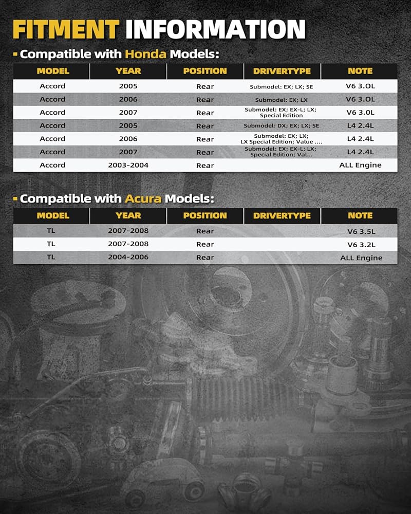 [Compatibility Info] - Compatible with Honda Accord 2003-2007, Compatible with Acura TL 2004-2008. Reference Part Number: 42200SDAA51, 512188, 80168860600, BR930383, WB12188