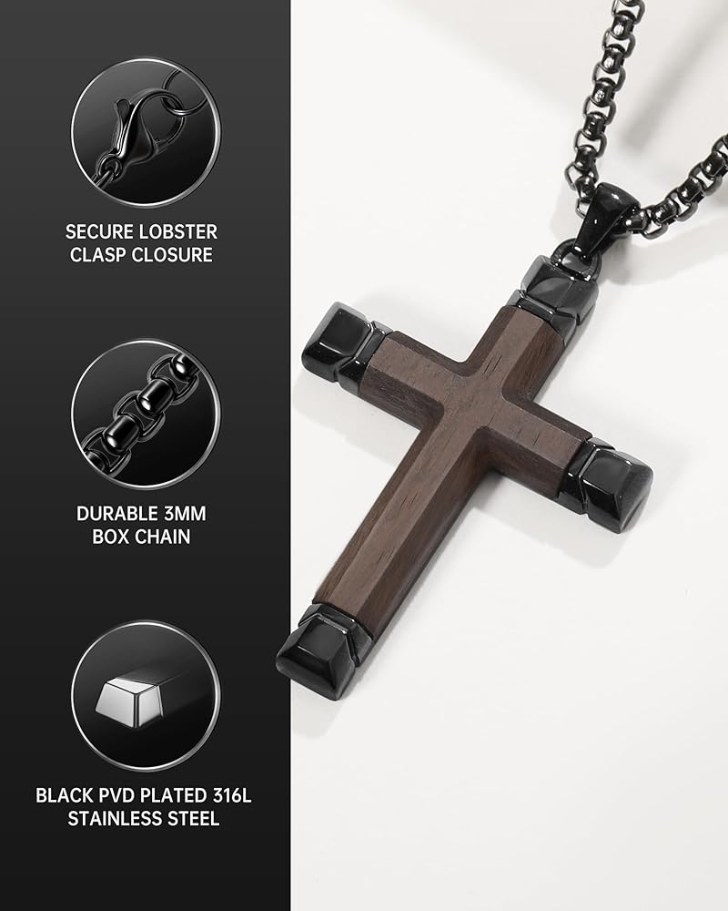 Wooden Cross Necklace for Men, Brown Ebony Masculine Mens Cross Necklaces Christian Black Stainless Steel Wood Crucifix Pendant, Includes 24-25" Box Chain