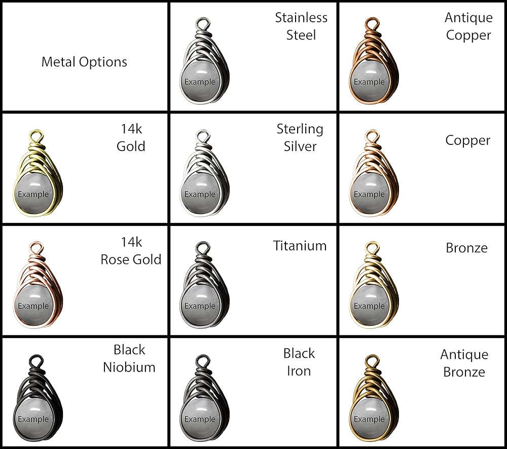 Available in the following metals: Stainless steel, copper, antique copper, bronze, antique bronze, sterling silver, black iron, titanium, 14k gold, 14k rose gold, black niobium