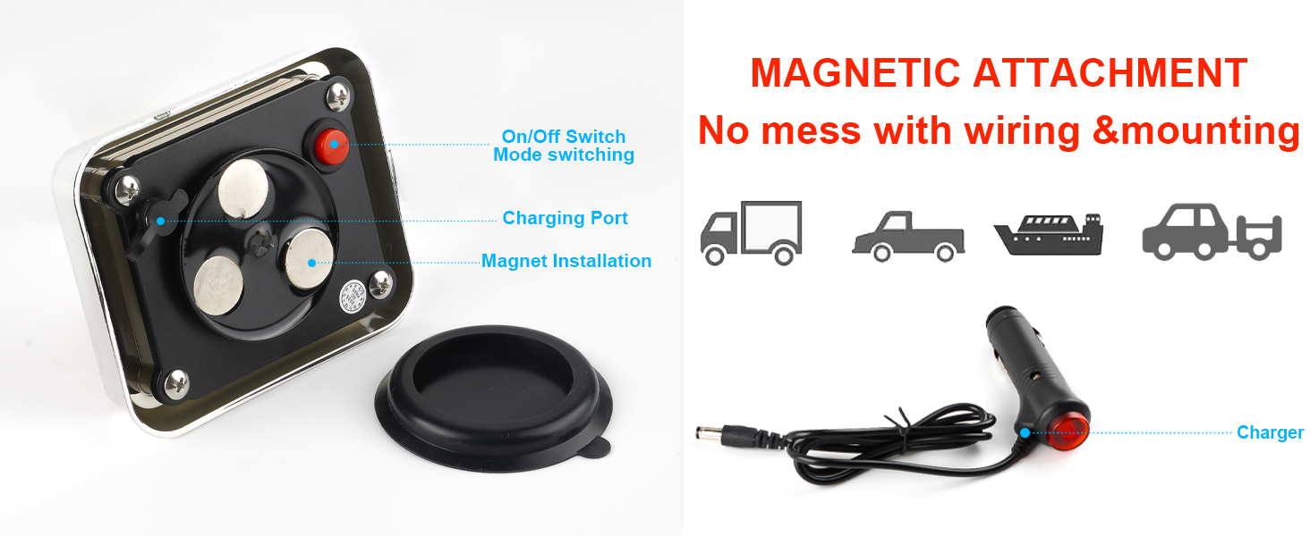 Shockproof Magnetic Base: The LIGBT Wireless Trailer Lights feature a magnetic mounting system with rubber suction cups. Each magnetic trailer light is equipped with 3 large large high-strength magnets, ensuring a secure attachment to your trailer body or any metal surface