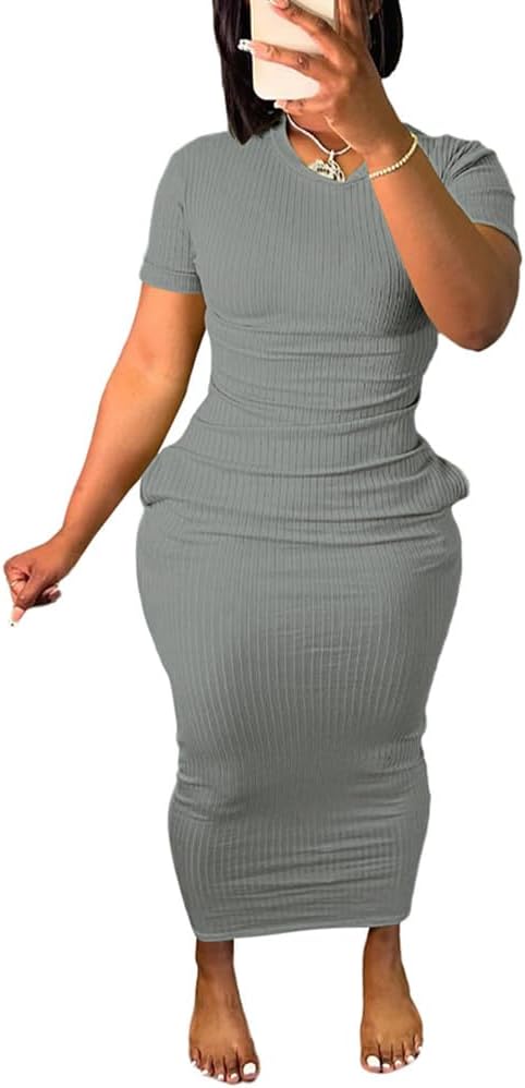 Women's Short Sleeve Dress T Shirt Bodycon Ribbed V Neck Maxi Sundress Basic Party Club Night Out Dresst-Gray-M