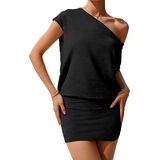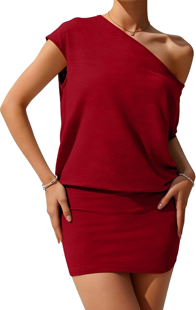 Off-Shoulder Asymmetrical Silhouette: One off shoulder design with an asymmetrical neckline, short or batwing sleeves and mini length highlights the collarbone. A relaxed fit through the bust is balanced by a fitted bodycon mini skirt that shapes the waist and hips, creating a sleek, modern silhouette with subtle Y2K appeal.