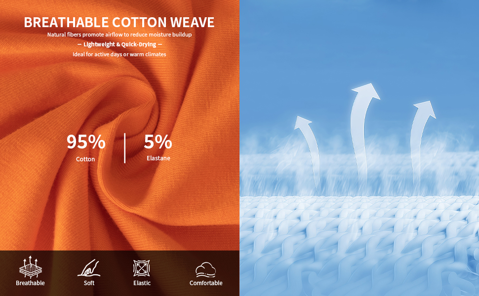 【Moisture-Wicking Cotton Fabric】:Advanced blended cotton technology quickly absorbs sweat and promotes airflow, keeping you dry and fresh all day—ideal for sports, daily wear, and hot climates.