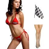 4 pc Speed car driver costume includes bra and g-string, one flag and one net stocking.
