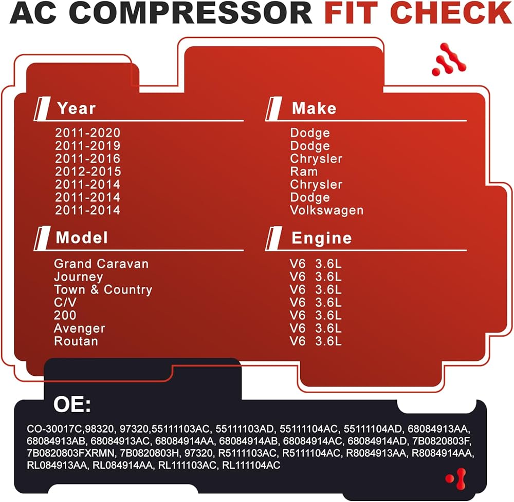 【EXACT OEM REPLACEMENT】-- Designed for seamless compatibility, this A/C compressor directly replaces multiple OEM part numbers including CO-30017C, 55111103AC/AD, 55111104AC/AD, 68084913AA-AC, 68084914AA-AD, 7B0820803F/H, 97320, 98320, and more. Choosing this correct automotive AC compressor ensures your vehicle's cooling system operates as the manufacturer intended.