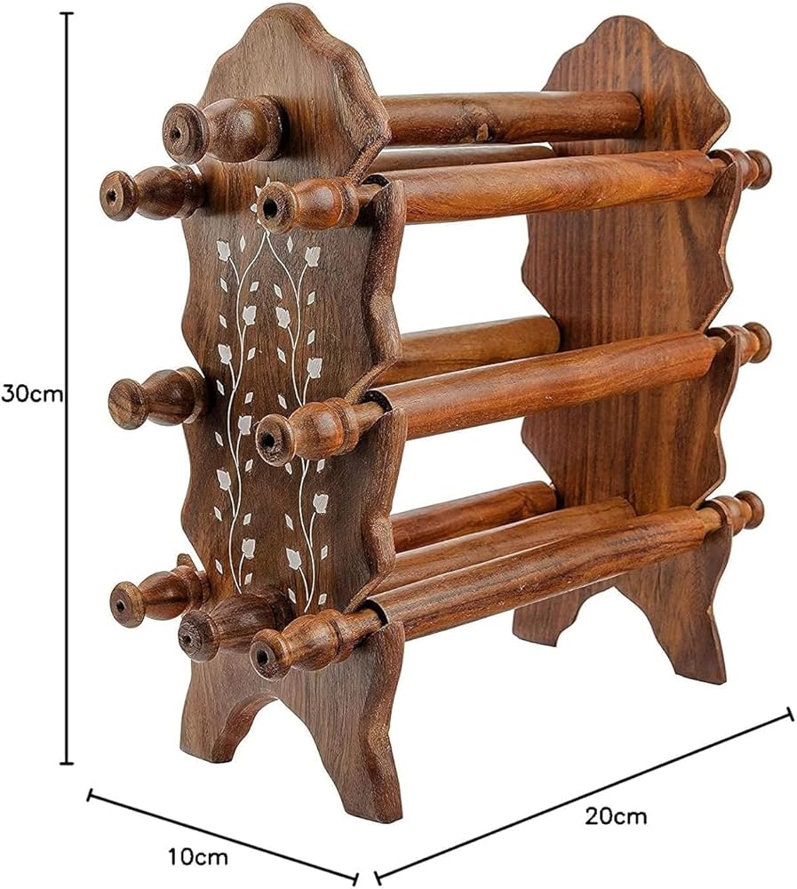 Add an elegant touch to your jewelry organization with this beautifully handcrafted wooden bangle holder. Standing at 12 inches tall, 9 inches wide, and 4.5 inches deep, this versatile jewelry stand features 6 horizontal rods perfect for displaying and storing bangles, bracelets, watches, headbands, and anklets. The rich brown wooden frame showcases intricate floral inlay work in a contrasting light tone, adding a sophisticated decorative element to your dresser or vanity. The thoughtfully designed structure allows easy access to your accessories while keeping them organized and preventing tangling. The sturdy construction and classic design make this stand both functional and decorative, serving as an attractive display piece that complements any bedroom or dressing area. This jewelry organizer makes an ideal gift for anyone looking to bring both style and organization to their accessory collection.