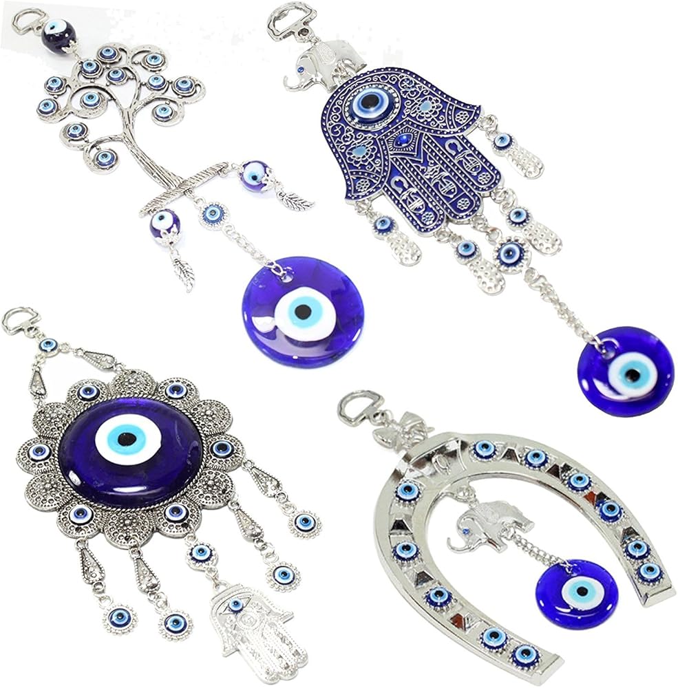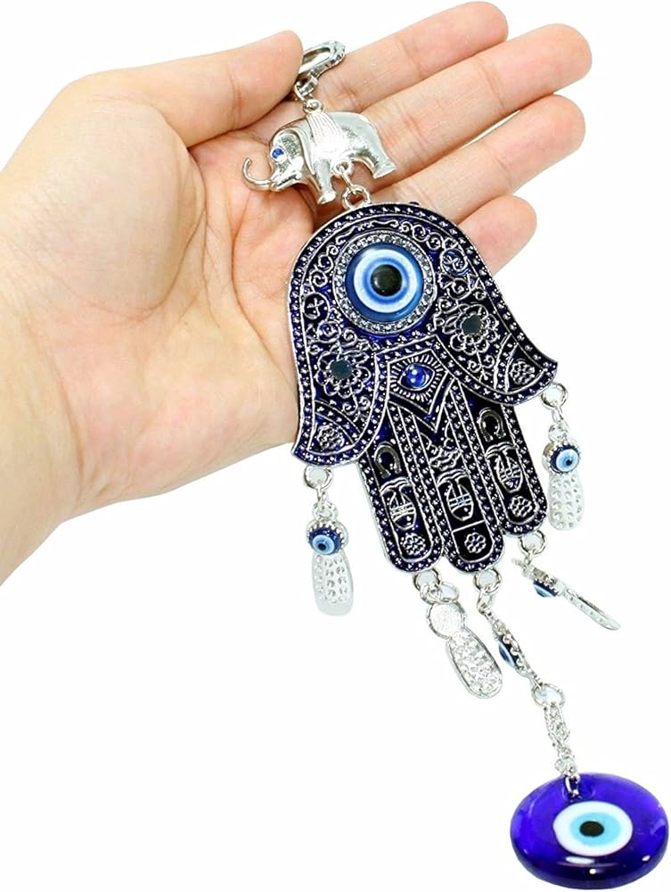Turkish Hamsa Hand Size: 2.5"(L) X 3.5"(H) X 9" long (approx.) Blue Life Tree Size: 10"(H) X 3"(L) (approx.) Blue Big Evil Flower size: 4"(H) X 4"(D) Total length: 10" Blue Evil Eye Horse Shoe Size: 6.5"(H) X 3.5"(L). Blue Evil Eye - Mavi Nazar The evil eye is a curse believed to be cast by a malevolent glare usually given to a person when they are unaware. Many cultures believe that receiving the evil eye will cause misfortune or injury. Talismans created to protect against the evil eye are also called "evil eyes". Talismans is an object which is believed to contain certain magical or sacramental properties which would provide good luck for the possessor or possible offer protection from evil or harm. These are meant to "reflect" the power of the evil look. When a person wears or carries an evil eyes with them, it guards against misfortune and from bad things happening in one's life. It helps to keep your life in balance, protects you from "bad karma" and ill-will that could otherwise have a negative effect on your well-being or your life in general. It is believed that if your evil eye amulet cracks or breaks, it has done its job of protecting you from some misfortune or bad luck and should be replaced! Hamsa is a palm-shaped amulet popular throughout the Middle East and North Africa. It's an old and still popular apotropaic amulet for magical protection from the envious or evil eye. Carry an evil eye with you at all time. You will never know when someone might be giving you the evil eye.
