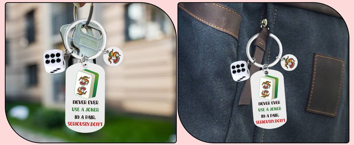 Mahjong Design: This keychain features a fun combination of mahjong and clown patterns. Printed with the humorous slogan “NEVER EVER USE A JOKER IN A PAIR. SERIOUSLY. DON'T,” it captures a classic mahjong joke that players instantly understand. Lighthearted and relatable, it's a great little gift for mahjong lovers who enjoy a touch of humor with their game