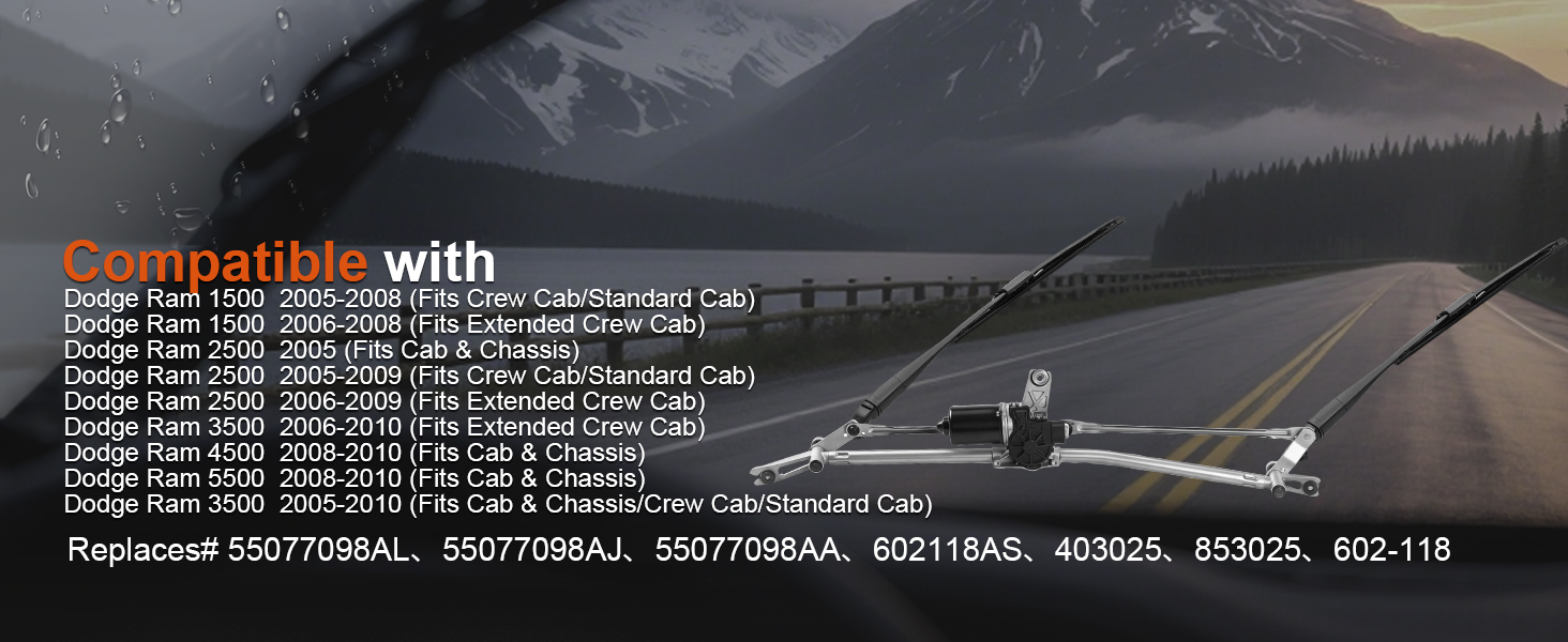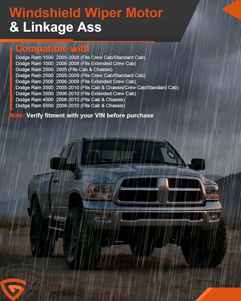 [PRECISE VEHICLE FITMENT] – This wiper motor and transmission linkage assembly is specifically designed to be Compatible with Dodge Ram 1500 2005–2008, Ram 2500 2005–2009, Ram 3500 2005–2010, Ram 4500 & 5500