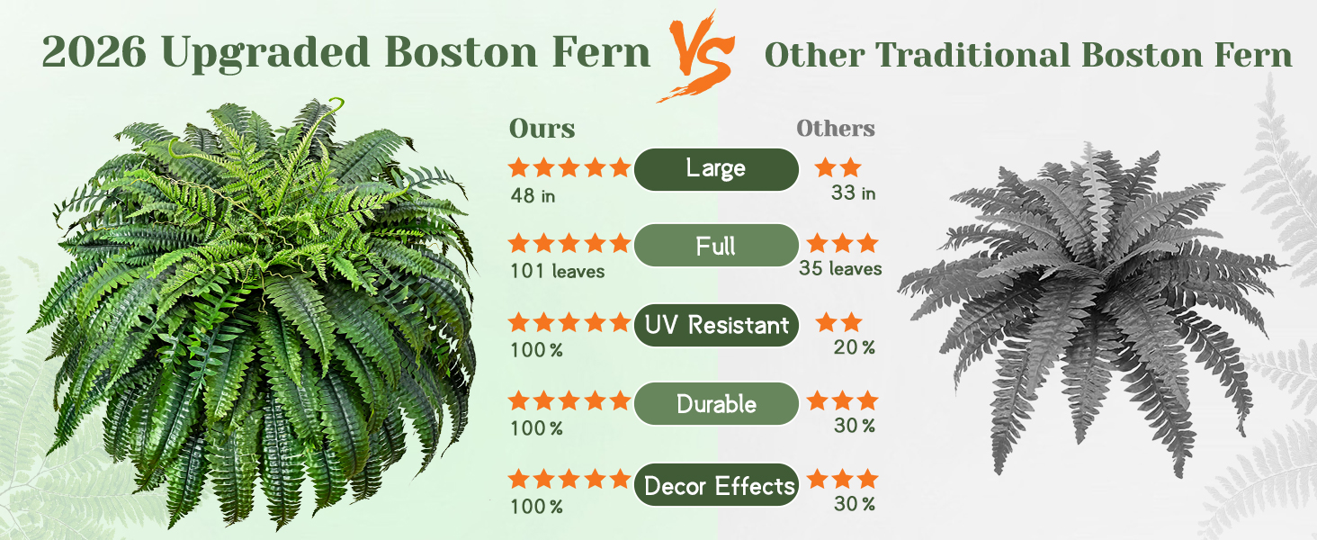 【Upgraded Larger & Fuller Faux Ferns】Our enhanced 48-inch ferns artificial plants large feature 101 lush leaves for unmatched fullness and volume. Larger, fluffier, and densely packed, it creates a full, bushy display that effortlessly fills a 20-inch pot.