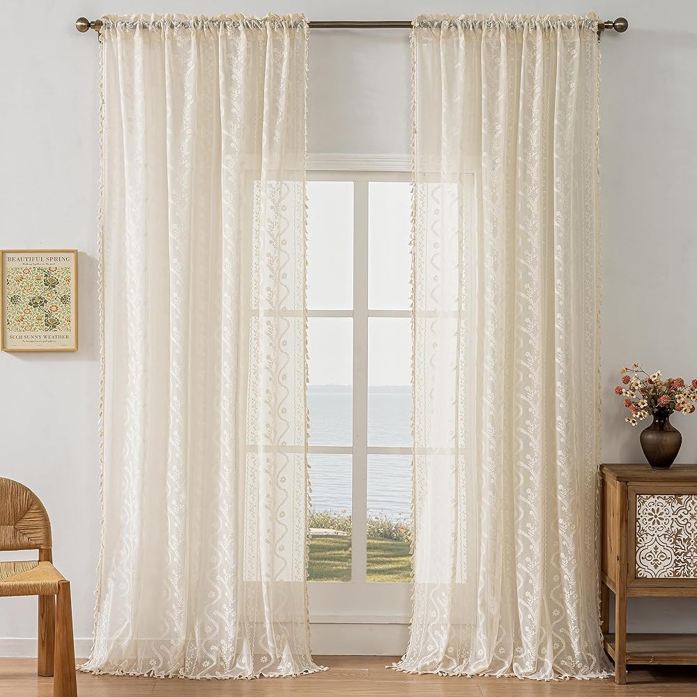 Vintage home decor:Enhance your living space with our exquisite beige lace curtains, where elegance meets tranquility. Designed to infuse every room with refined sophistication and a serene ambiance, these curtains capture the gentle essence of nature. The soothing cream hue evokes the freshness of the outdoors—perfect for all season, when a touch of natural beauty can transform your home into a peaceful retreat.