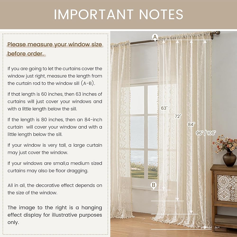 Package Includes:2 pack W52"xL96" lace sheer curtains (104" total width) with 3" rod pocket for easy installation,Compatible with standard rods ≤1.6" diameter,Ready to transform bedrooms/living rooms instantly