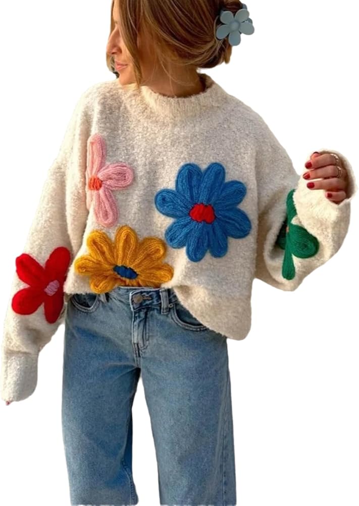 Versatile style: Cute oversized floral sweaters for women. Pair with jeans, skirt and your favorite boot for a must-have outer look! Loose aesthetic knitwear top suits all shapes.