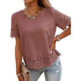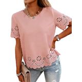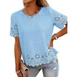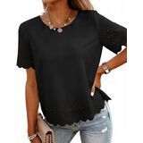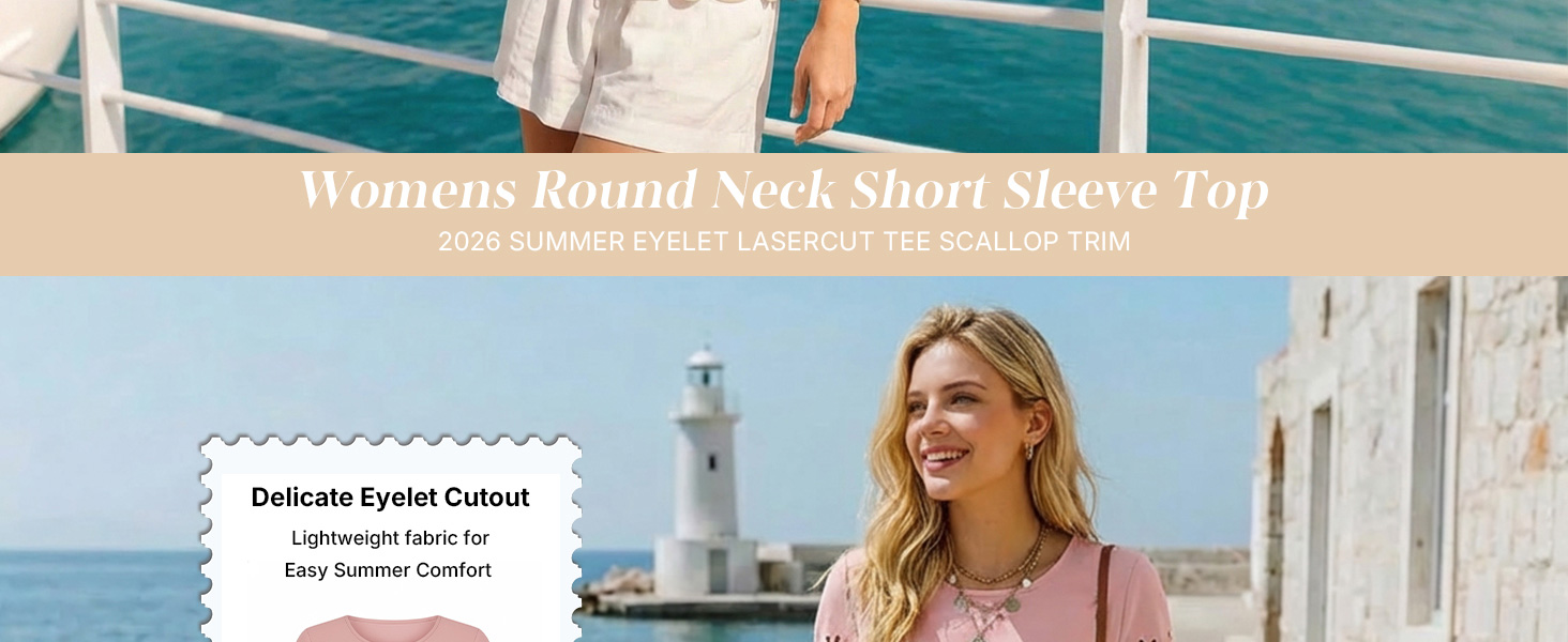 This summer top is all about easy style with a little extra detail. The eyelet-style cutouts and scalloped hem give it a soft, feminine look while still keeping things clean and simple. The lightweight fabric feels smooth and comfortable, making it a great choice for warm days. It' s designed with a relaxed fit that hangs nicely without clinging and fits true to size. The classic round neckline and short sleeves make it easy to wear, while the length hits at the hip for effortless styling. Whether you' re heading to a casual office, running errands, traveling, or putting together an everyday outfit, this top is easy to reach for. It pairs well with jeans, slacks, or skirts and offers a polished upgrade from a basic tee—simple, versatile, and wearable all season long.