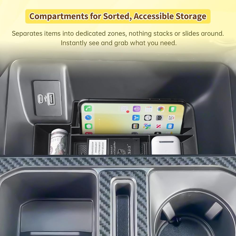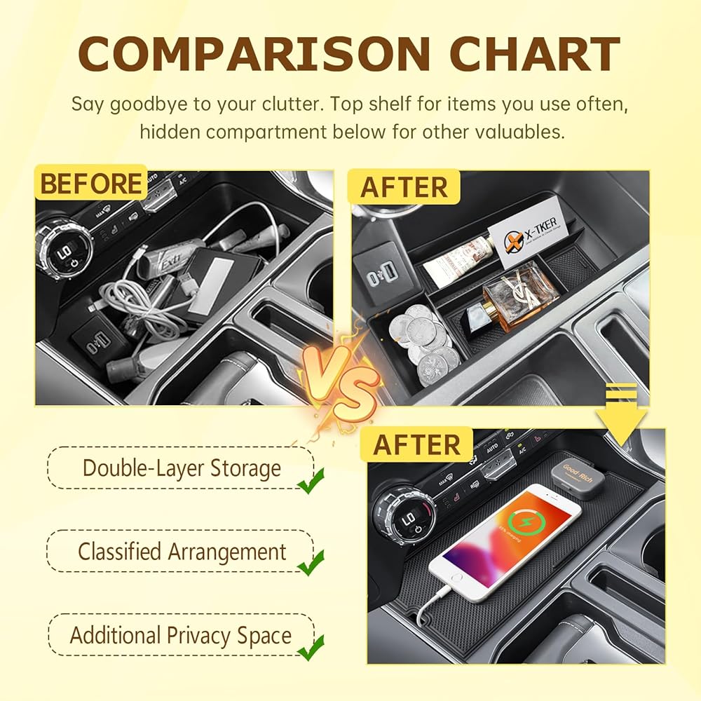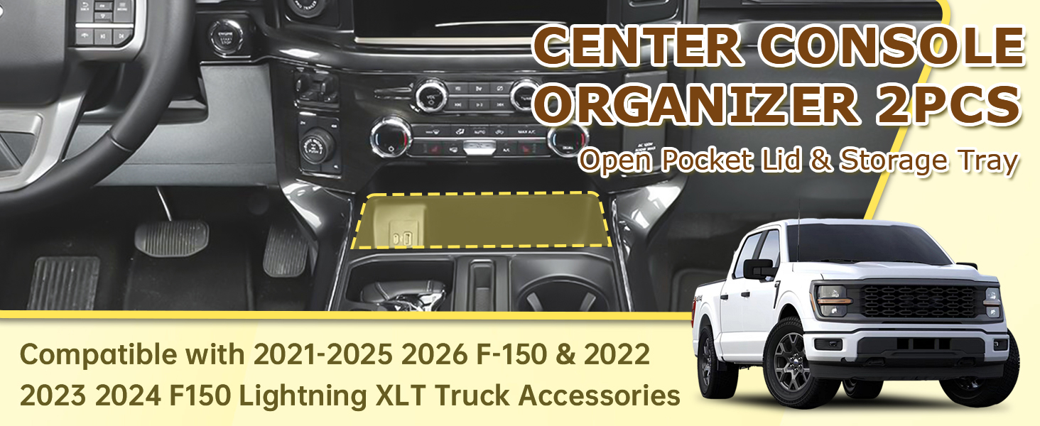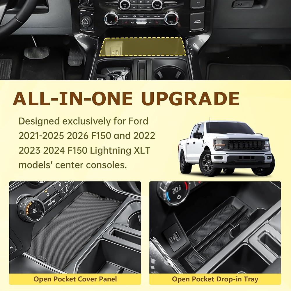 X-TKER Custom-Fit Design : Tailored precisely for F-150 (2021, 2022, 2023, 2024, 2025, 2026) and F150 Lightning XLT (2022–2024). Slides into the open front console for a seamless factory look. (Note: Not compatible with models with cover wireless charging consoles.)