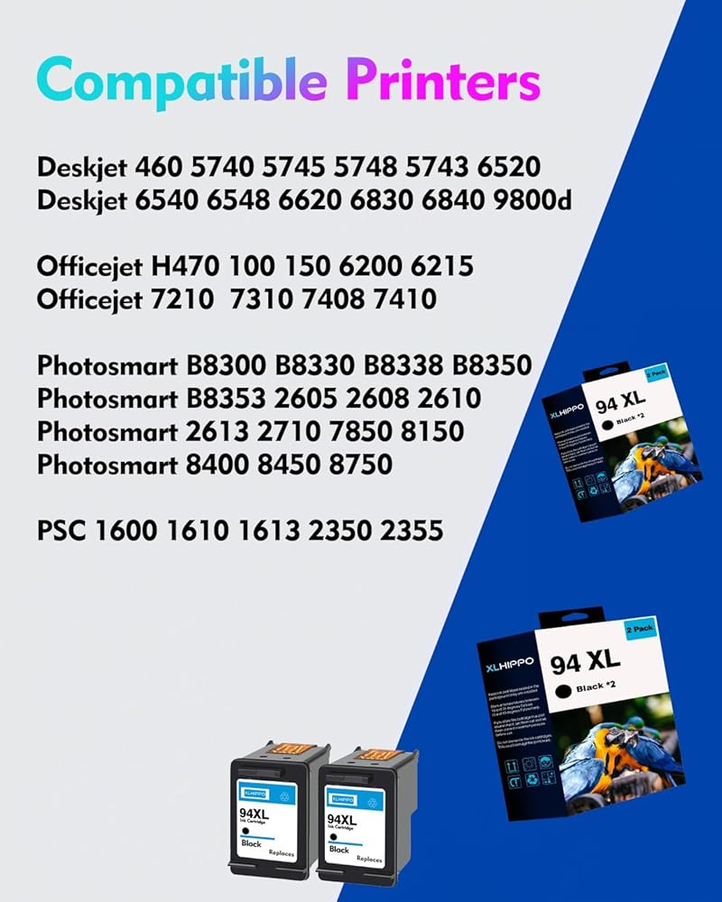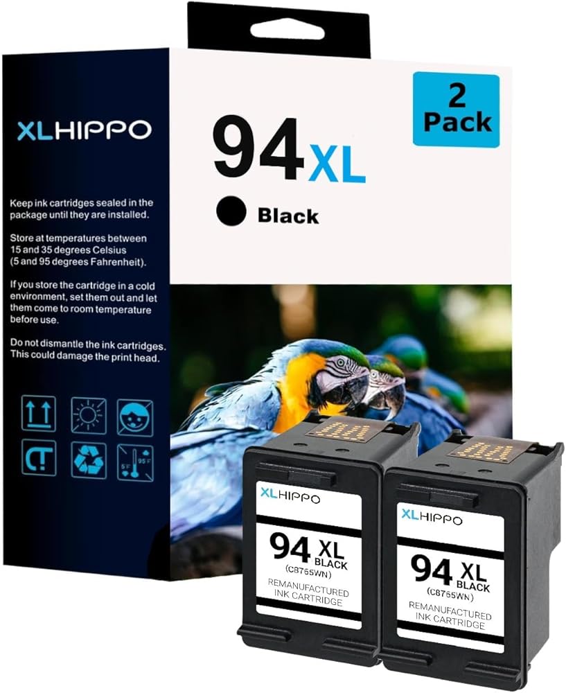 94 Ink Cartridge Replacement for HP 94 Black Ink Cartridge Compatible for HP OfficeJet H470 100 150 DeskJet 5740 460 PSC 1610 1600 PhotoSmart B8330 Printer (2 Pack High Yield 94XL Black C8765WN)
