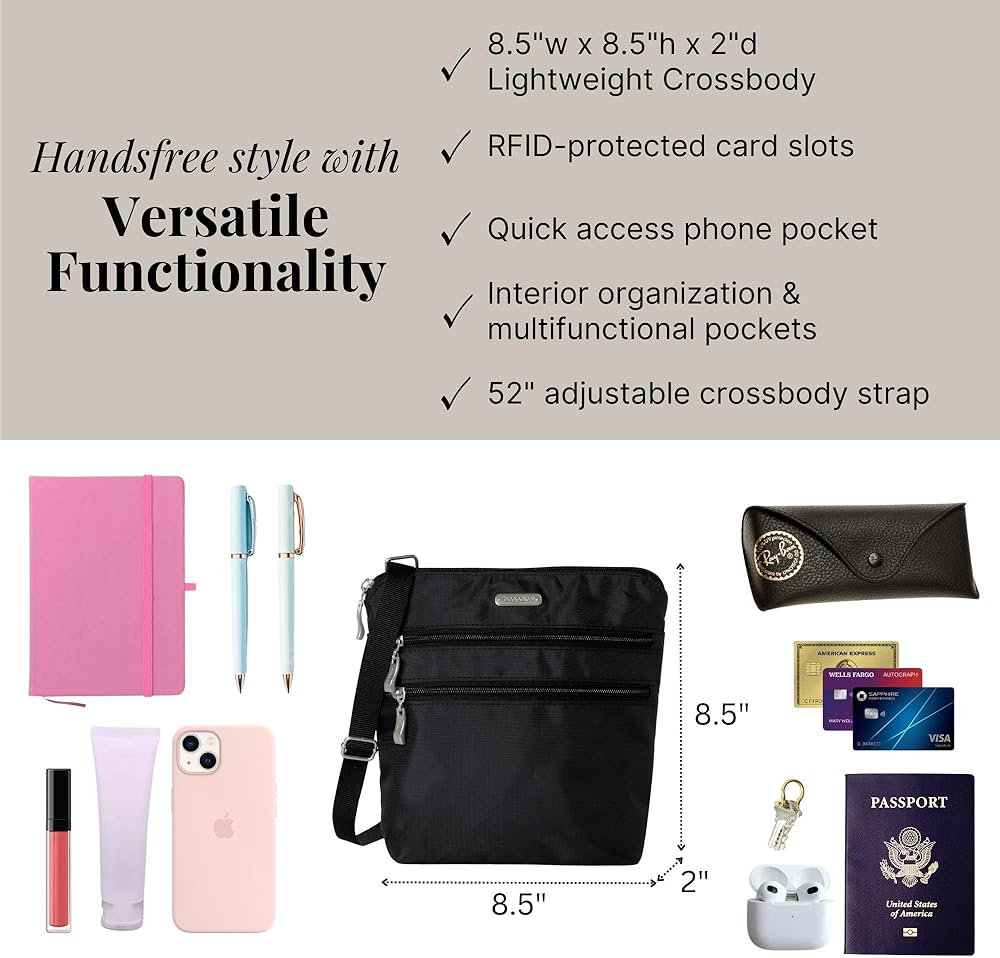 Lightweight Design: Breeze through your day with this crossbody bag that weighs just 6 ounces and measures 8.5'' wide, 8.5'' tall, and 2'' deep with a 52'' adjustable strap.