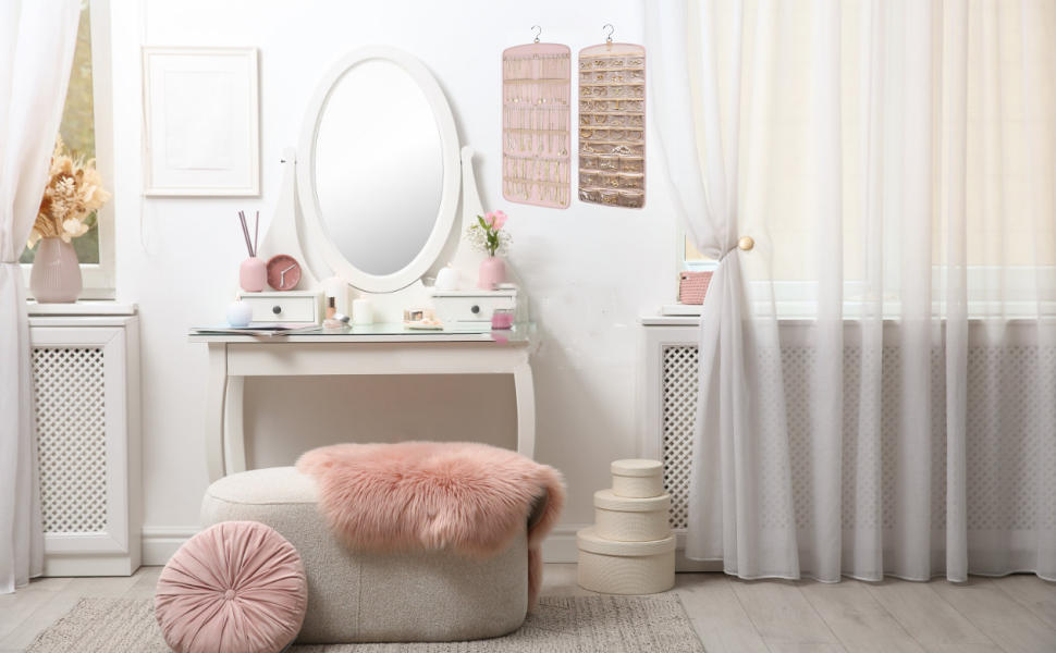 LARGE STORAGE SPACE - the overall size of the hanging jewelry holder measures approx. 14 x 33 inches.Stylish way for storing, sorting and displaying different items. Not only holds jewelry, but also works great for hair accessories, nail polishes, makeup, toiletries, crafts, cables, cards, etc