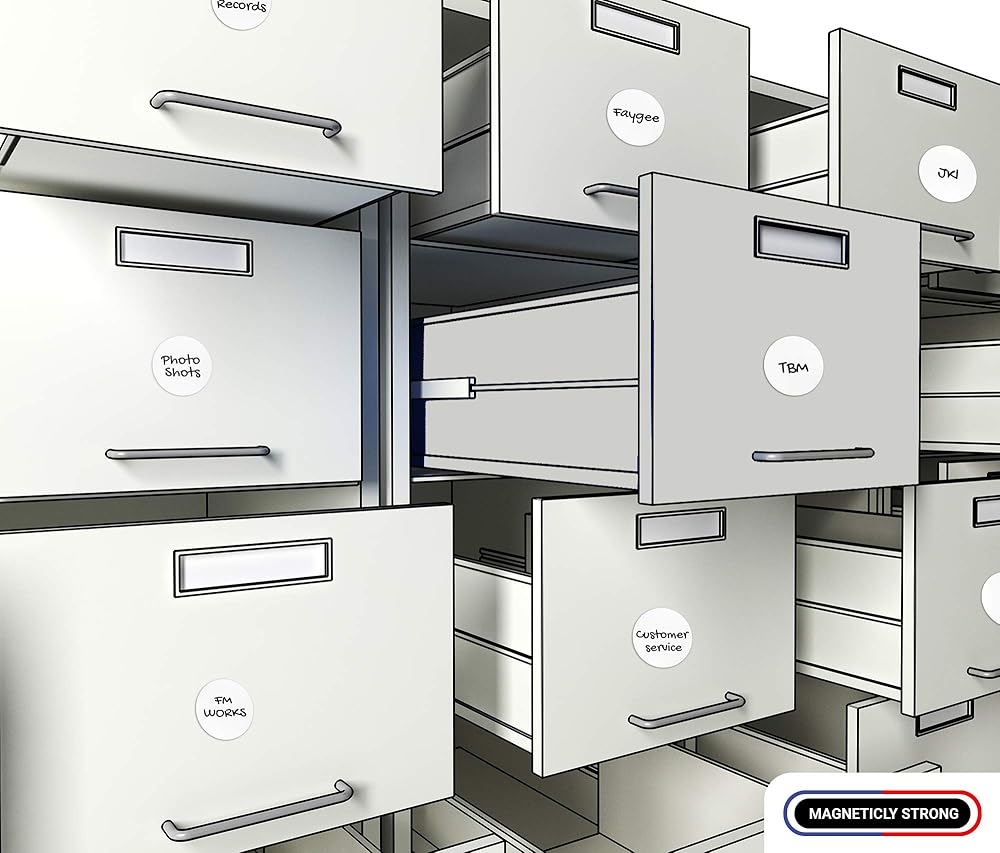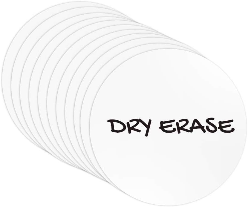 These dry erase magnetic labels are 2" Diameter in size and 20 mil in thickness. The front side is a white dry erase finish and the back is black magnet. 20 mil in thickness. Dry Erase / Write on Wipe Off! Makes a great magnetic shelf label! 12 Labels per pack.