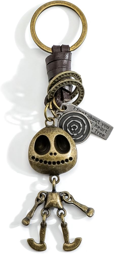 • 💀 Retro Cartoon Skeleton: This vintage keychain features a playful, vintage-style cartoon skeleton charm cast in antiqued bronze. Its whimsical yet spooky design captures retro Halloween charm with character.