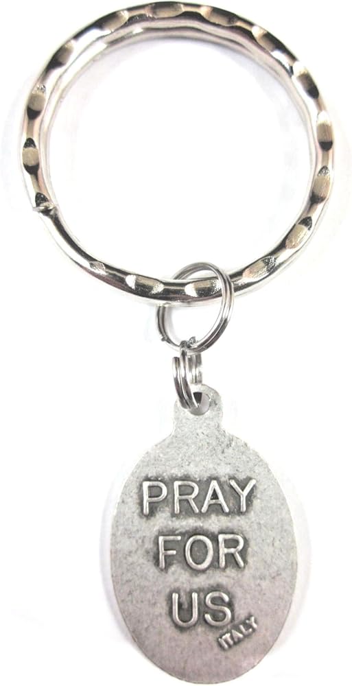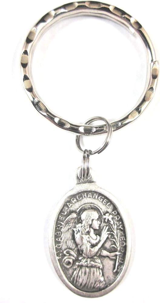 1" oxidized medal on a 1" hammered key ring. Patronage: Clergy, Diplomats, Messengers, Post offices, Radio, Secular clergy, Stamp collectors, Telephones, Television. Prayer card included, image detail shown.
