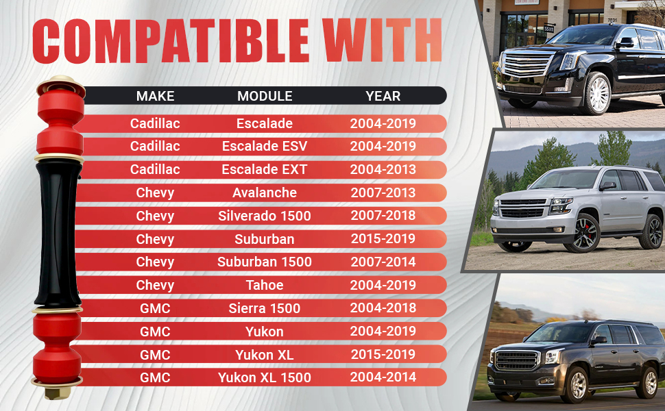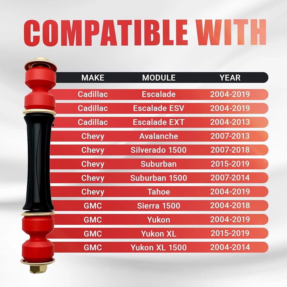 [Chevy Model Fitment] Sway bar end links are compatible with Chevy Avalanche (2007-2013), Silverado 1500 (2007-2018), Suburban (2015-2019, 1500 2007-2014), and Tahoe (2004-2019)