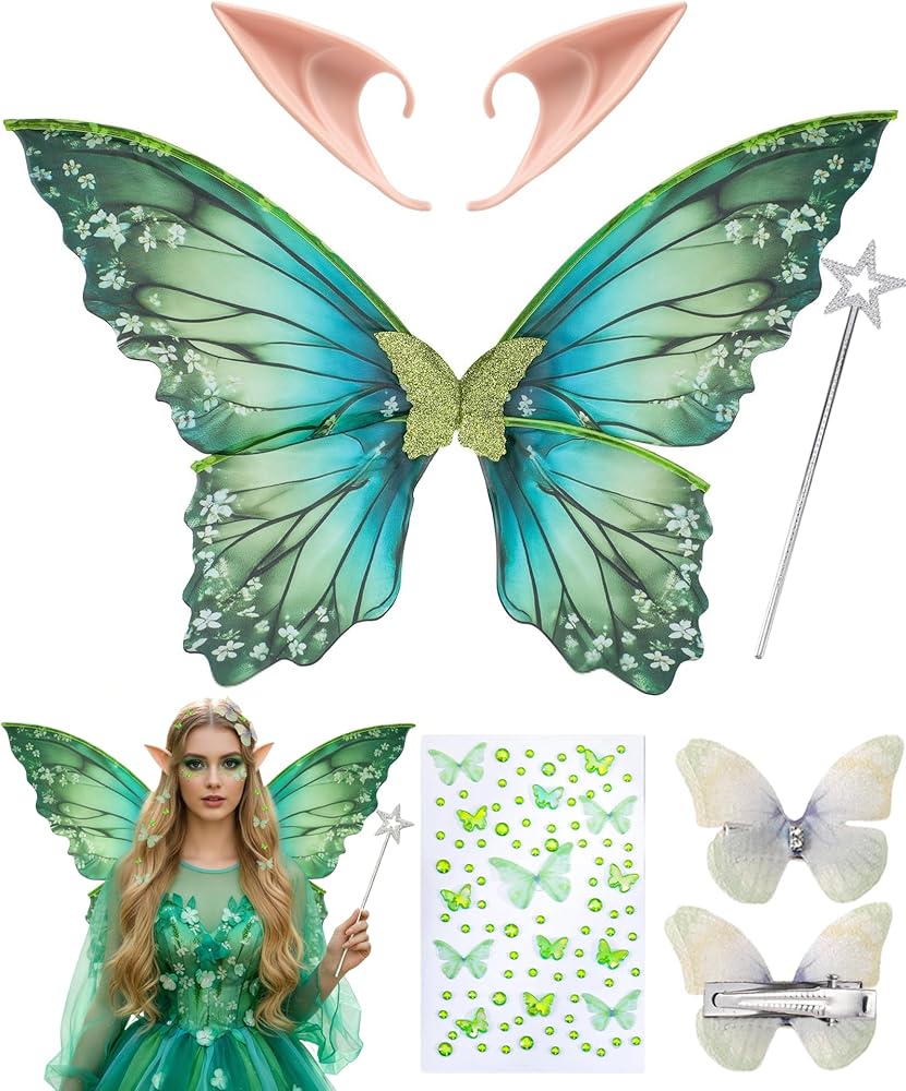 Product Description: Package Include: a pair of butterfly fairy costume wings, a pair of elf ears,1X flower fairy crown.enter a magical world of elves with our fairy costume wings costume set. This is a prop to help you become the focus of the party.Sparkle Halloween fairy costume wings for s and adults. These bright butterfly wings are perfect for Halloween costume parties, fairy birthday parties, fairy costumes, cosplay party costumes, tooth fairy costumes, and makeup masquerades. You can use it with puffy dresses, fairy dresses, princess dresses, tops, fairy wands, fantasy sandals, etc