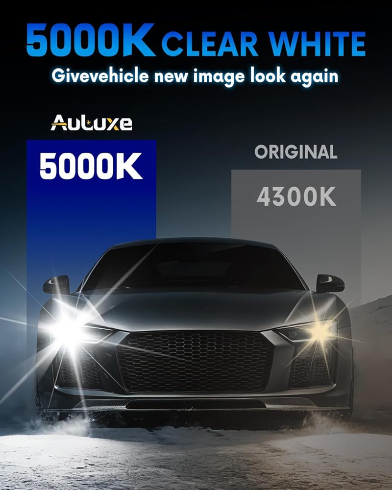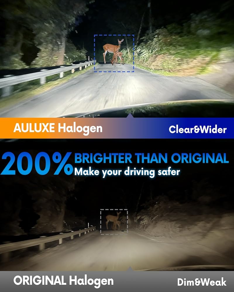 AULUXE H11/H8/H9 halogen bulbs (for headlights/fog lights, 12V 100W, white 5000K, high/low beam) are 200% brighter than other halogens—delivering wider, farther visibility to spot deer, wildlife, rocks, or obstacles sooner for safer night driving. They fit high/low beams, emit light close to natural sunlight for comfort, and have strong shock resistance to stay stable on bumpy roads. Performing well in all conditions, they're unaffected by moisture, dust, extreme temps, or humidity. Easy to install with no special upkeep, just regular checks and cleaning keep them working their best. AULUXE guarantees quality: contact us before buying with compatibility questions or if you're unsure of your vehicle/bulb model (our customer service will help fast). Thanks for your trust!