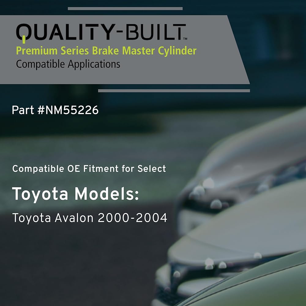 QUALITY-BUILT Premium brake master cylinders are engineered to restore factory brake responsiveness and deliver consistent hydraulic pressure-whether you're navigating city streets or cruising the highway. Ideal for vehicles needing a dependable OE-style replacement, they offer a direct-fit solution to maintain braking integrity. Each unit is manufactured to precise OEM standards using high-quality castings and seals for reliable fluid control, leak resistance, and extended service life. The result? Confident pedal feel, accurate pressure modulation, and smooth, predictable stops in every condition. QUALITY-BUILT Premium master cylinders undergo 100% pressure testing and include factory-style reservoirs where applicable, ensuring proper fluid capacity and fitment right out of the box. Internal components are engineered for durability and consistent output-mile after mile. Designed for easy installation and long-term reliability, QUALITY-BUILT Premium master cylinders are trusted by DIYers and professionals alike. Pair them with QUALITY-BUILT brake components for a complete brake system refresh-built for durability, engineered for peace of mind.PART SPECS: DESC: QUALITY-BUILT Premium Brake Master Cylinder with Reservoir NM55226 - Compatible with 2000-2004 Toyota Avalon Master Cylinder Bore Diameter inches: 0.875