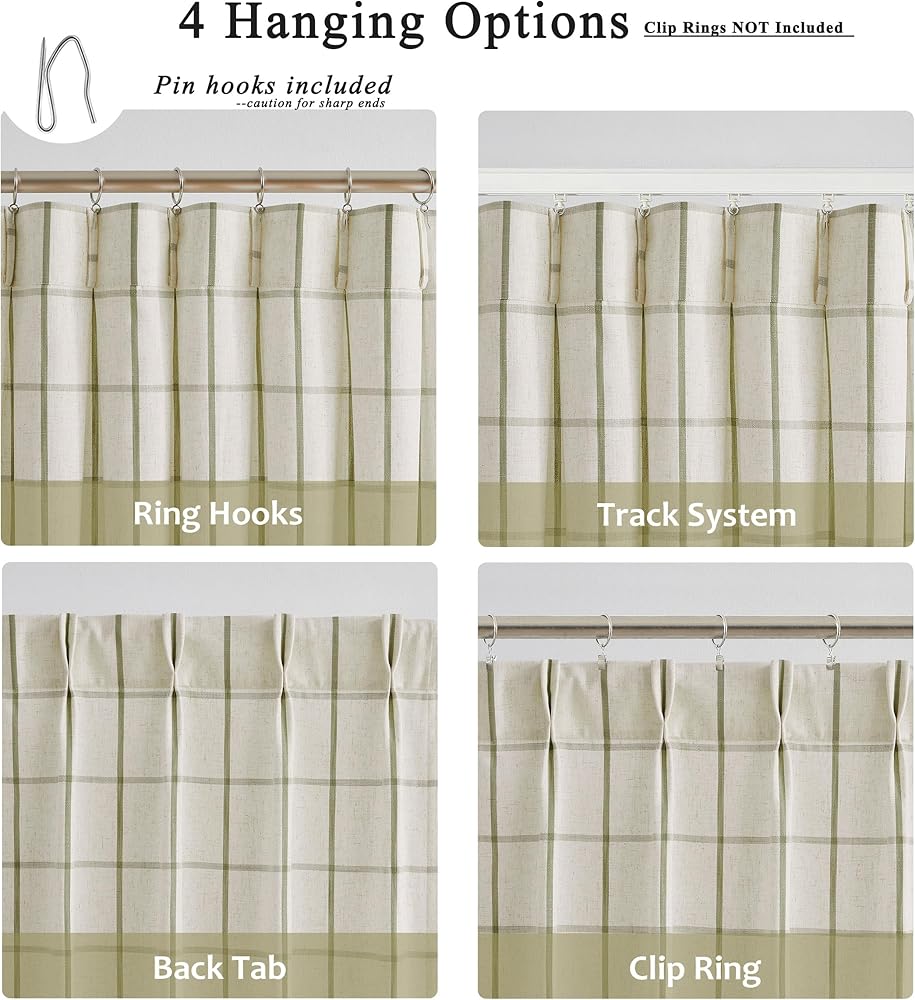 Central Park Sage Green Plaid Pinch Pleated Semi Sheer Curtain 95 Inch Linen Blended Checkered Window Treatment Drape for Modern Living Room Bedroom with Back Tabs Hooks, 40" Wx95 L, 2 Panels