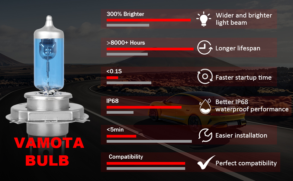 SUPER BRIGHT - VAMOTA Halogen Headlight Bulbs are customized 100W high power bulbs with super white light (5000K) that are 300% upgradable. The focused beam pattern allows you to see the entire road without worrying about dark spots or blinding oncoming traffic