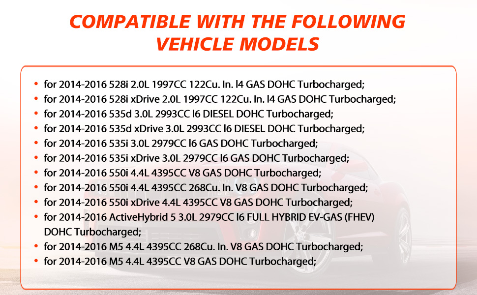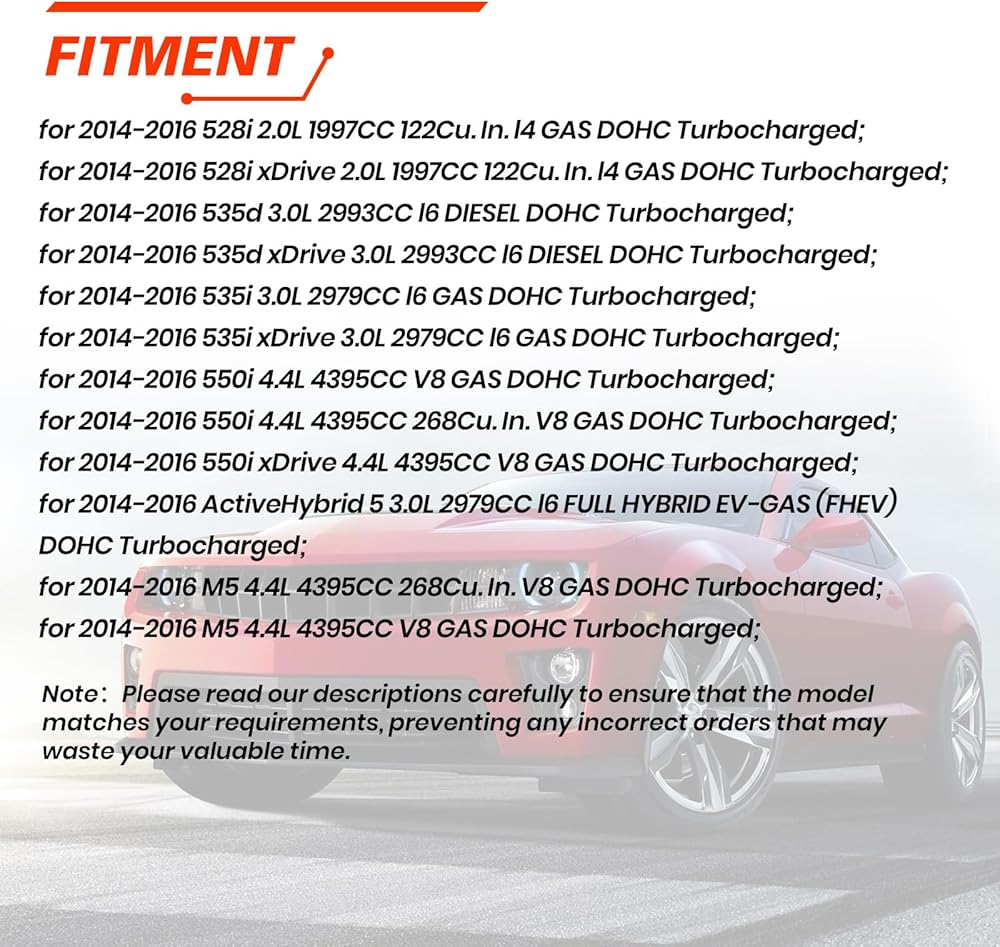 【Compatible With】For 2014-2016 528i 2.0L, for 2014-2016 528i xDrive 2.0L, for 2014-2016 535d 3.0L, for 2014-2016 535d xDrive 3.0L, for 2014-2016 535i 3.0L, for 2014-2016 535i xDrive 3.0L, for 2014-2016 550i 4.4L, for 2014-2016 550i 4.4L. Please read our descriptions and pictures carefully to ensure that the product's applicable model is the same as your needs, so as not to place the wrong order and waste your precious time.