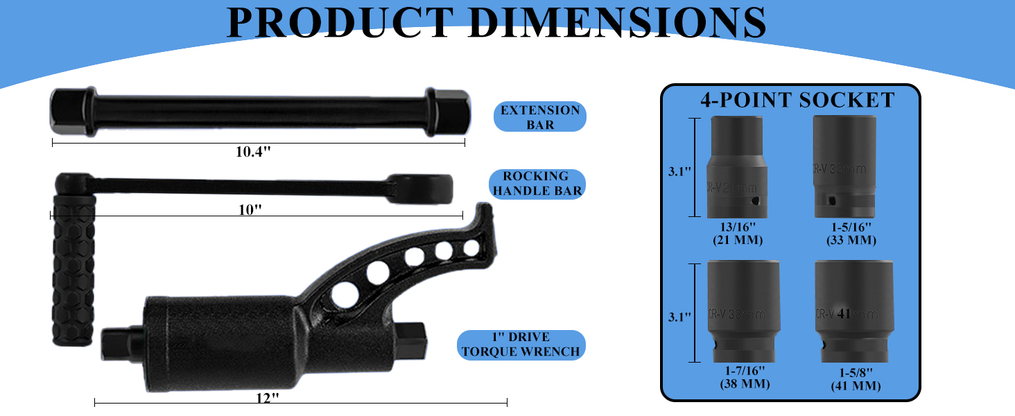 Versatile Socket Set: This set includes an 4-piece Cr-v socket set, providing you with a wide range of socket sizes to tackle various lug nut sizes from 21mm to 41mm.
