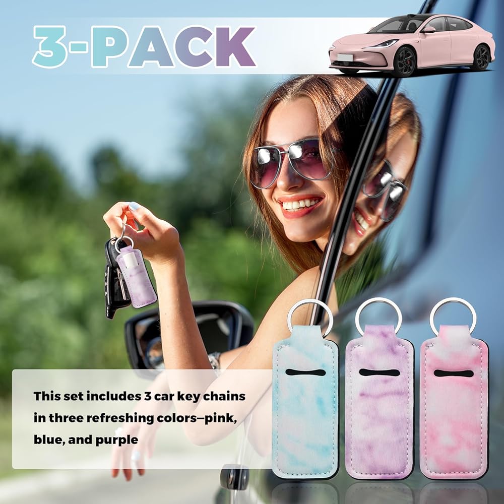 3-PACK: This set includes 3 car key chains in three refreshing colors—pink, blue, and purple. Pink is sweet and adorable, blue is simple and refreshing, while purple is gentle and elegant. You can use them according to the color of your lipstick cases or your daily outfits