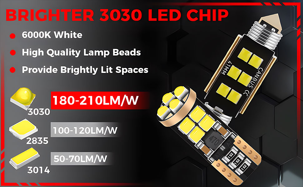 INCREASE VISIBILY -- 6000K White; Advanced 3030 LED is 300% brighter than your original halogen bulbs. The LEDs completely light up the inside of the vehicle, allowing you to see clearly anywhere in the vehicle at night!