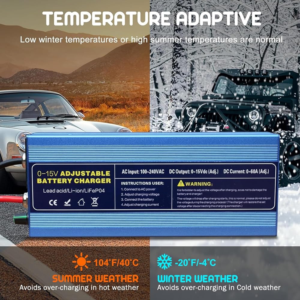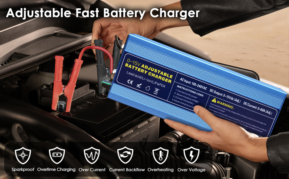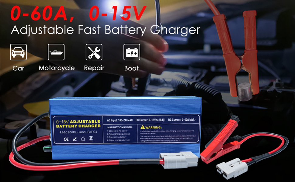 GREAT DESIGN FOR LIFEPO4 BATTERY-- Capacity. Li Smart Charger is specially designed for 12.8V LiFePO4 battery or 12.6V Li-ion battery, the current/voltage both are adjustable, the range is 0-60A / 0-15V adjustable. implementing the special 2-stage constant current/constant voltage (CC/CV) charge algorithm with smart LED indicators. This charger has a specific Pre-Charge function, which is designed to activate all types of BMS by allowing current into lithium batteries reading from down to 0V.
