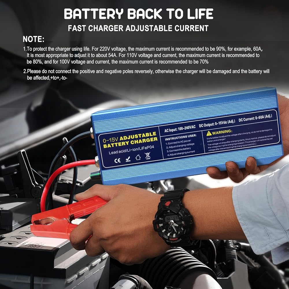HIGH-EFFICIENCY CHARGING-- Adjsutable current & voltage 0-60A / 0-15V. constant voltage about 14.6V/12.6V, very suitable for large capacity LIFEPO4 battery or lithium battery charging. Only needs 1.5 hours of fast charging time to fully charge a 12V 60Ah LiFePO4 battery compared with 3 amps multi-charger which needs 20 hours to fully charge a 100Ah battery.(!!!Note: The fan will automatically stop running for a few minutes after a power outage.)
