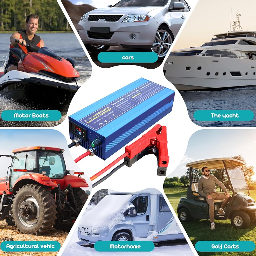 HIGH QUALITY MATERIAL--Our lithium battery charger is made of aluminum alloy, with surface oxidation treatment, high hardness, anti-drop and moisture-proof, anti-oxidation, built-in cooling fan, keep the charger itself cool. Cooling protects your charger and battery. Charging is safe. Intelligent circuit chip, improve charging conversion rate, stabilize discharge voltage, charge better than ordinary chargers, more durable, weighs about 1.8KG.
