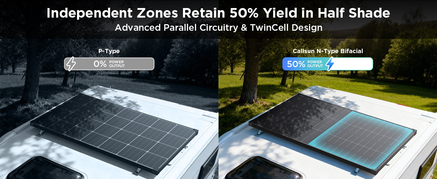 Power Through the Shade: Don't let obstacles stop your harvest. Typical RV arrays stop charging when partially shaded by trees or AC units. Our TwinCell Parallel Circuitry allows each section to work independently, maintaining continuous power flow to your battery bank even when parking at wooded campsites or near roof obstructions.