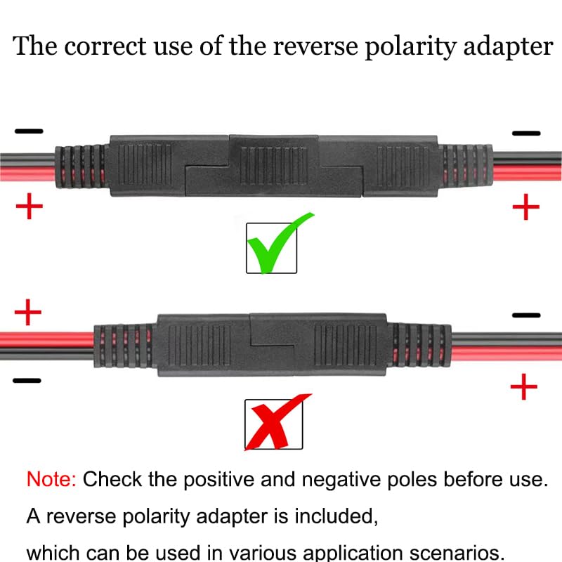 👍 includes two single-plug standard SAE connection extension cables of the same polarity, which can be used separately or in combination with a reverse polarity adapter (including an additional reverse polarity adapter), making the connection more flexible and convenient, suitable for a wider range of applications.