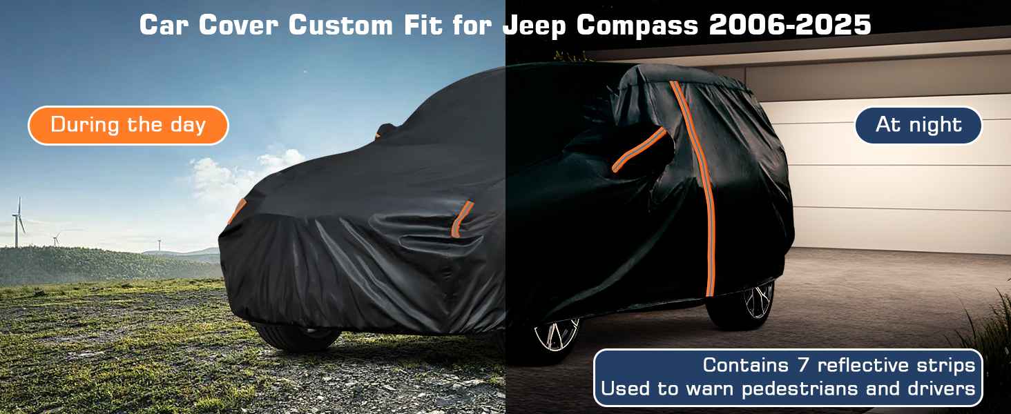 Safety and Convenience: (1) Driver's side zipper door for easy access. (2) Four windproof straps are sewn on the four tires to help you fasten the cover to prevent it from being blown over by strong winds. (3) Mirror pocket helps you put on the car cover easily and protects the mirrors from damage. (4) The windproof strip at the bottom passes through the middle of the car to ensure that the car cover will not be blown away. (5) The elastic hem ensures a custom fit and provides all-round wind protection. (6) Reflective strips can alert others at night. (7) Waterproof strips are pressed at the joints (2 waterproof strips).