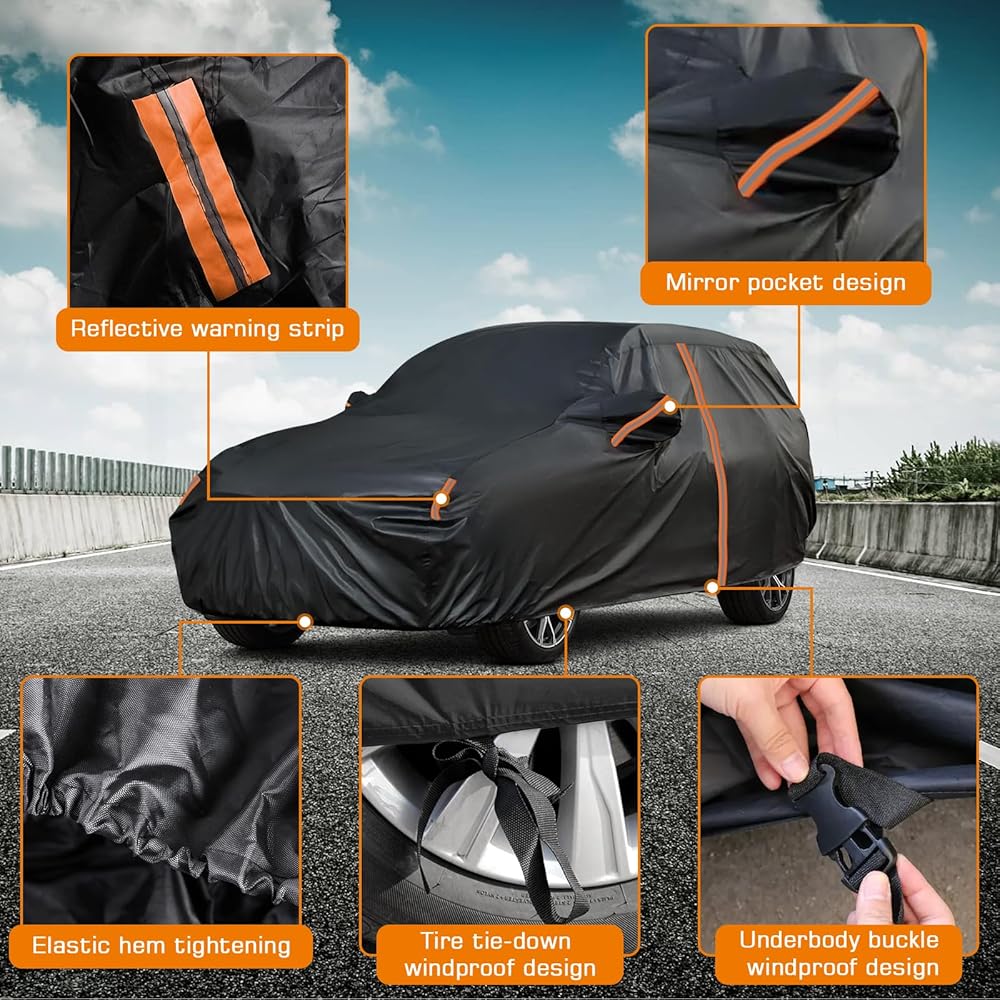 Waterproof and Heat-Resistant Premium Material: This SUV full cover is made of high-density PU coated Oxford fabric with a multi-layer structural design, which is waterproof, heat-resistant and quick-drying. The outermost high-reflective aluminum layer blocks 99.9% of UV rays and is 100% waterproof. The thicker and softer fabric inside provides protection for the vehicle's paint.