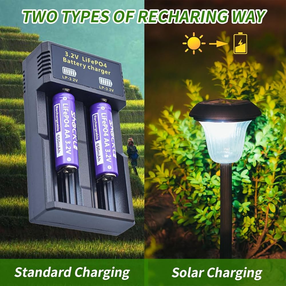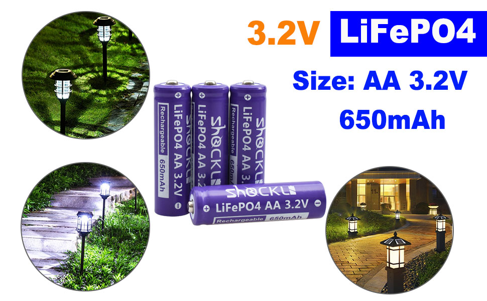 【AA 3.2V LiFePO4 Specification 】Volt: 3.2V, Capacity : 650mAh, Dimensions (H. x Dia.) : 50.5x14.4 mm / 1.97x0.55 inch, keep solar lights on 5-8 hours( fully charged), 1500 Times Cycle Life, You can use 2- 3 years