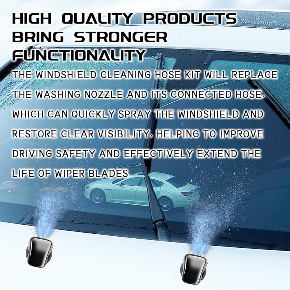 • 【Dual-Nose Direct Spray】Our windshield washer kit features an upgraded dual-nose direct spray design, allowing for adjustable spray angles, even water pressure, concentrated water flow, and wide coverage. It precisely sprays windshield washer fluid, quickly dissolving dust, stains, and insect residue on the windshield, working in conjunction with wipers for efficient cleaning and improved visibility.