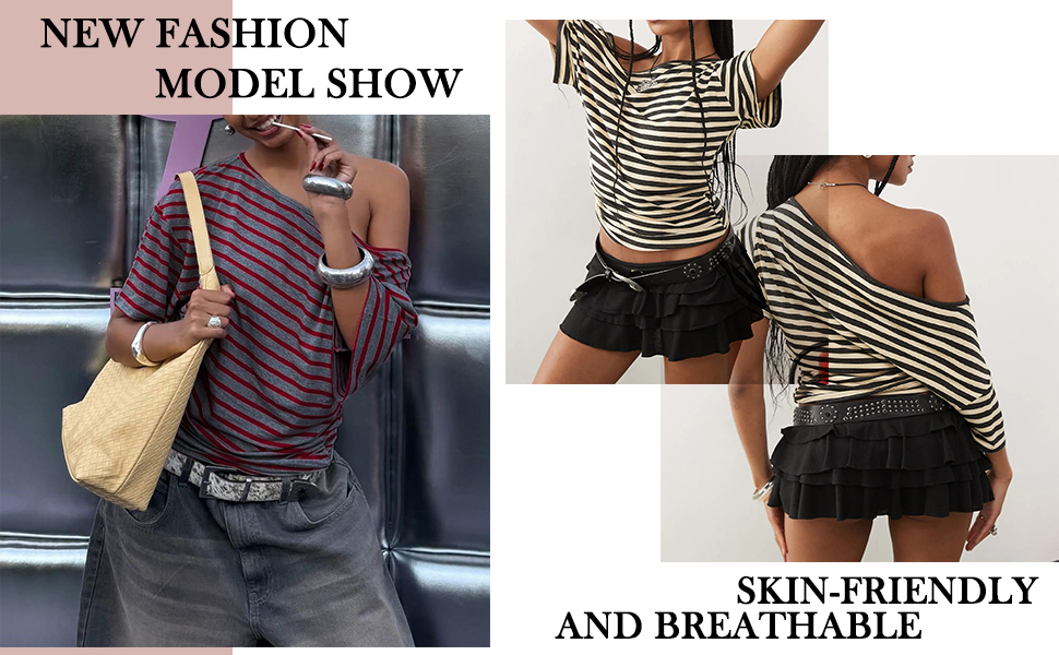Matching:Grunge stripe off the shoulder tops easily match every piece in your wardrobe and create a sexy look with effortless Y2K fashion. Pair it with jeans, skirts, shorts, or leggings for a relaxed and stylish summer look