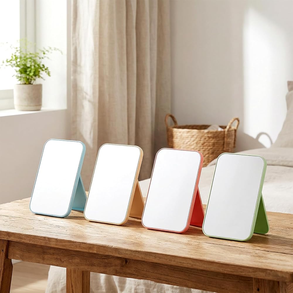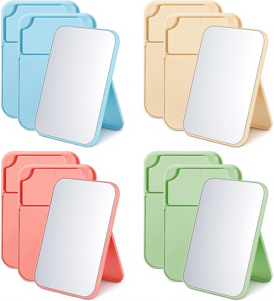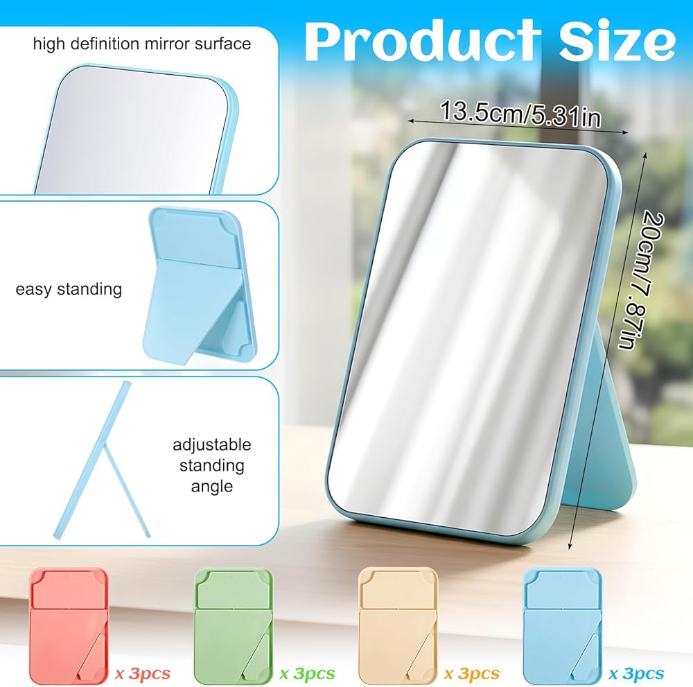 Package Contents: You will receive 12 packs of desktop mirrors in 4 different colors. Each mirror measures approximately 7.87 inches (H) x 5.31 inches (L) x 0.6 inches (D). Portable size, fits any tabletop, takes up minimal space, and is easy to move and store, making it ideal for travel, dates, and camping.