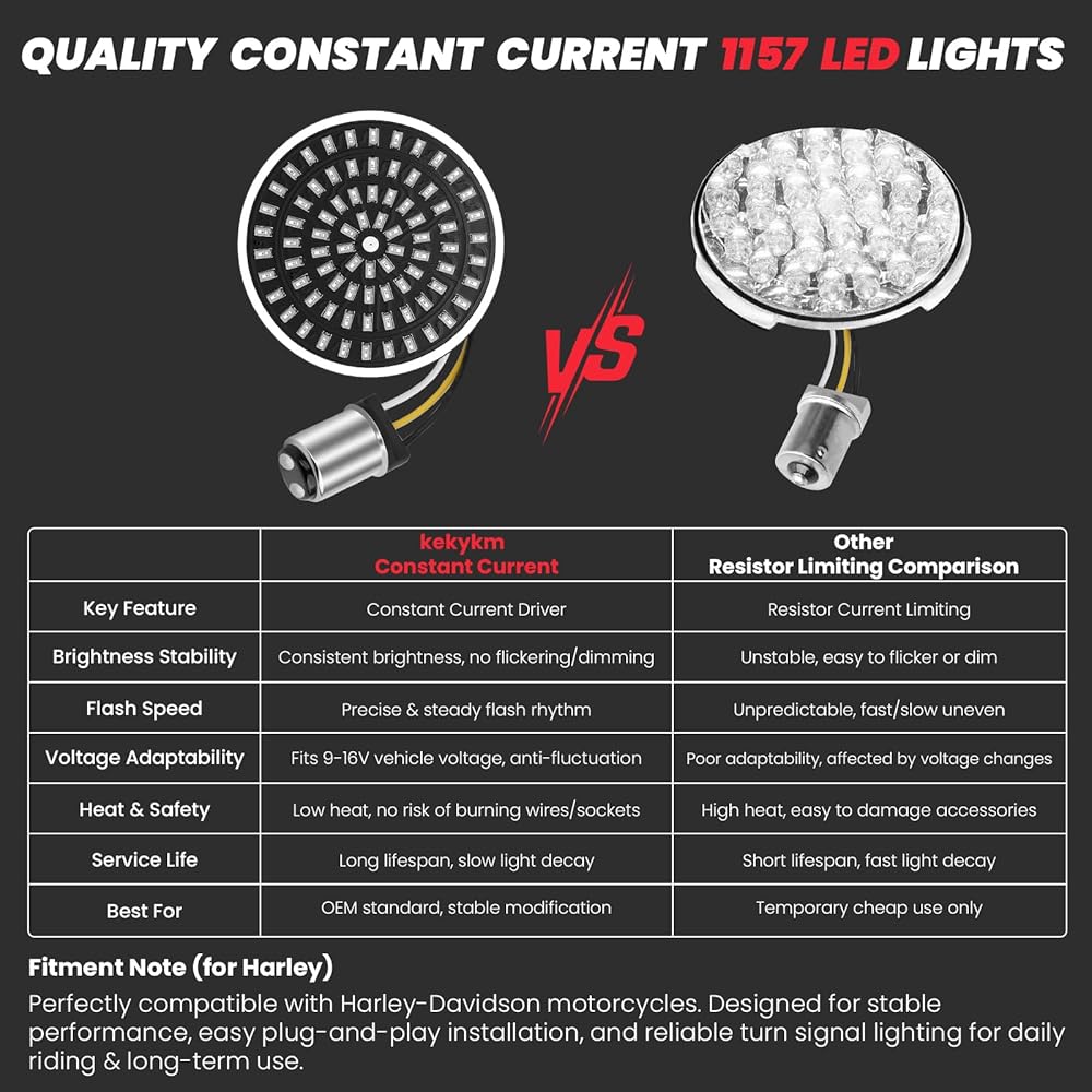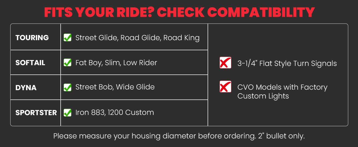 【Notice】2" Front & rear all 1157 socket (dual-contact for brake/running/turn functions), NOT fit 3-1/4" flat style, center tail light, CVO/ ultra models or European versions– perfect direct replacement for Harley OEM turn signals with brake capability.