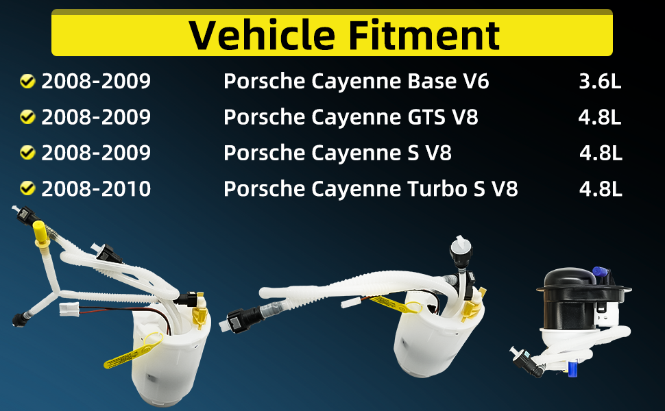 إعداد السيارة: مضخة الوقود اليسرى اليمنى وفلتر الوقود A2C53377802Z 95562093201 95562042100 بديل لـ 2008-2009 Porsche Cayenne Base V6 3.6L؛ 2008-2009 بورش كايين جي تي اس V8 4.8L; 2008-2009 بورش كايين S V8 4.8L; 2008-2010 بورش كايين توربو إس V8 4.8L.