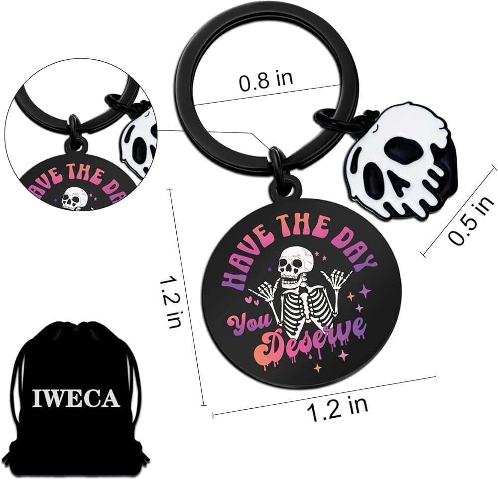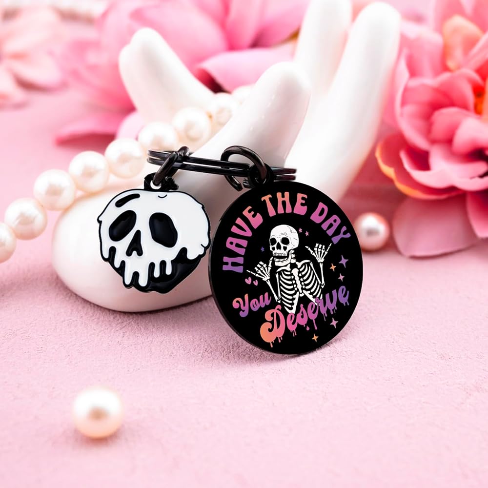 Funy Goth Gifts, Witchy Gifts For Women - A Unique And Stylish Accessory Engraved With “Have The Day You Deserve” For Halloween, Perfect Gift For a Friend Or a Little Something For Yourself, This Skull Keychain Is Sure To Make a Statement.