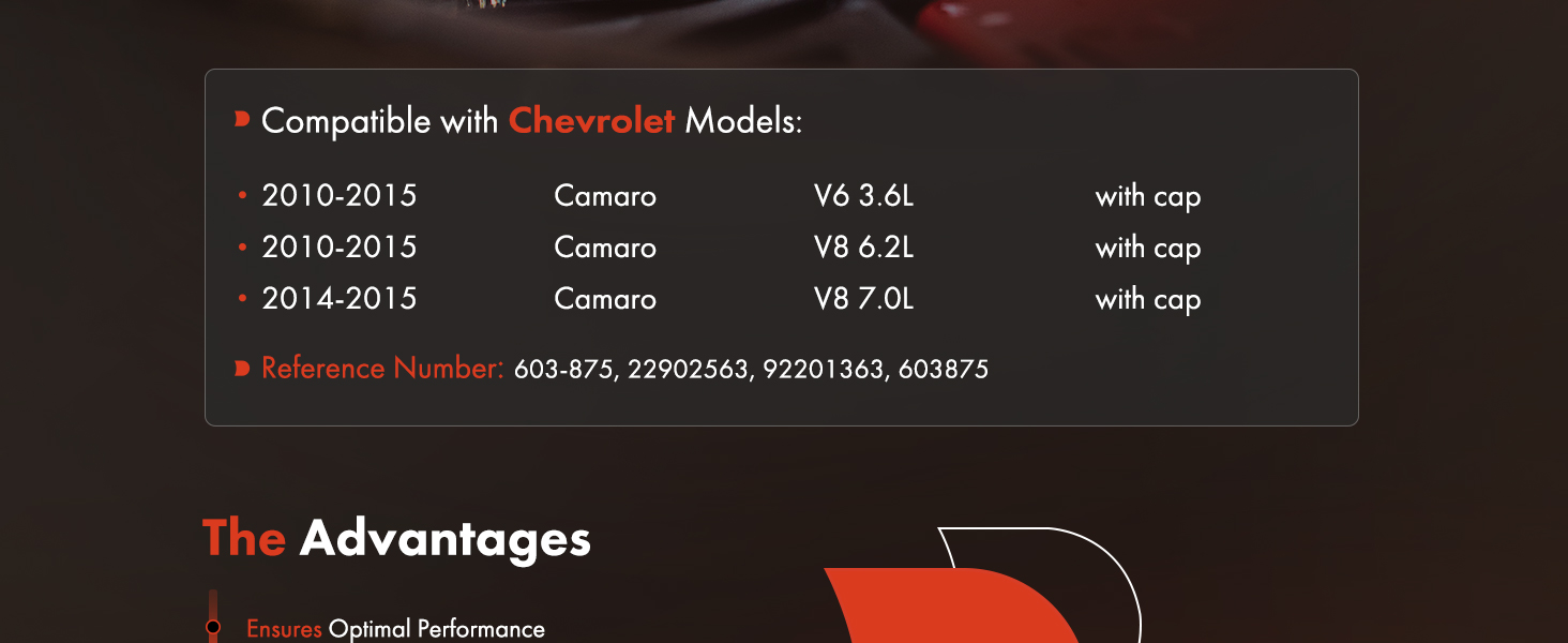[Vehicle Fitment]: Compatible with Chevrolet Camaro 2010-2015 V6 3.6L/V8 6.2L, Camaro 2014-2015 V8 7.0L